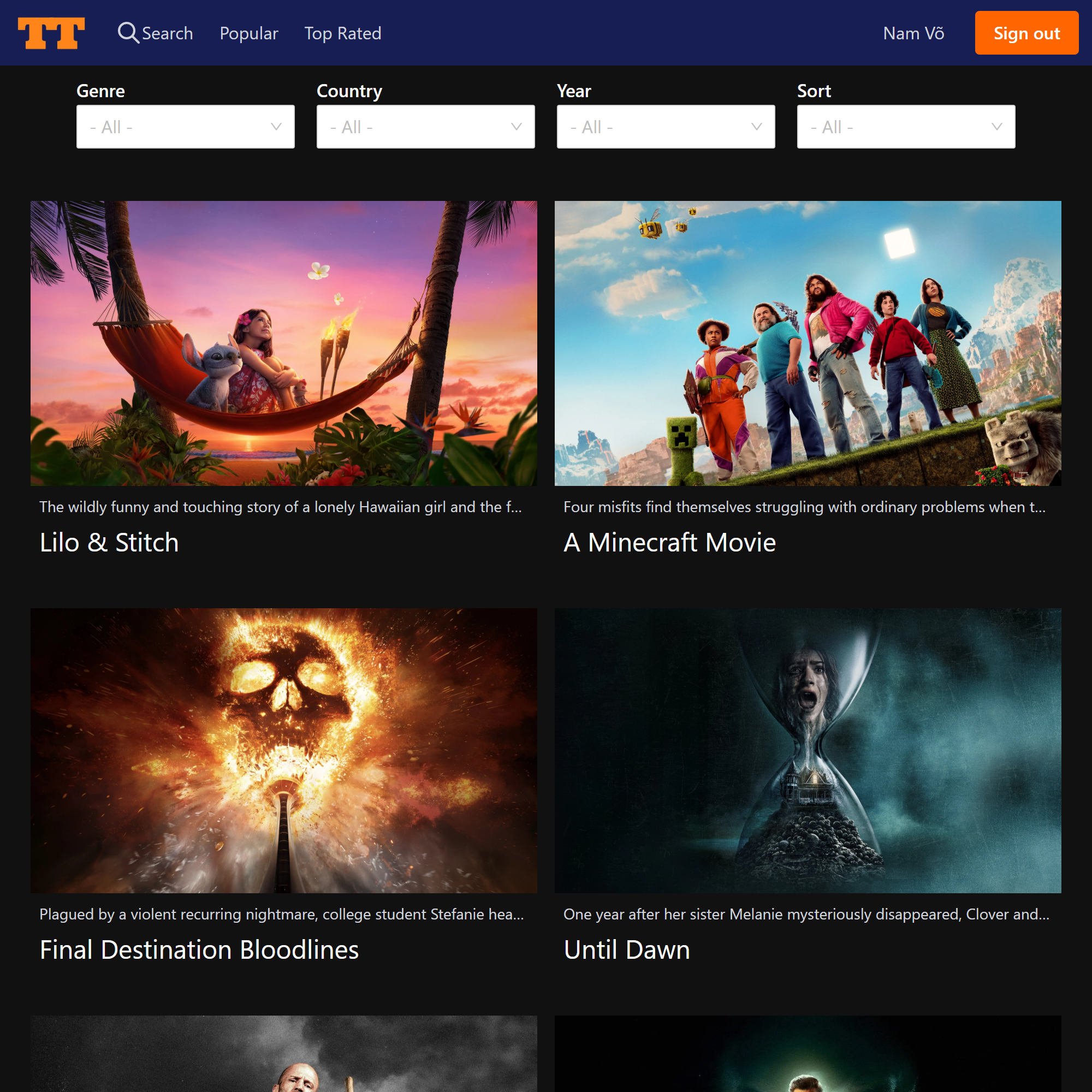 A sleek and user-friendly website for exploring movies and watching trailers. Featuring filters by genre, country, release year, and popularity, it offers a seamless and engaging movie discovery experience.